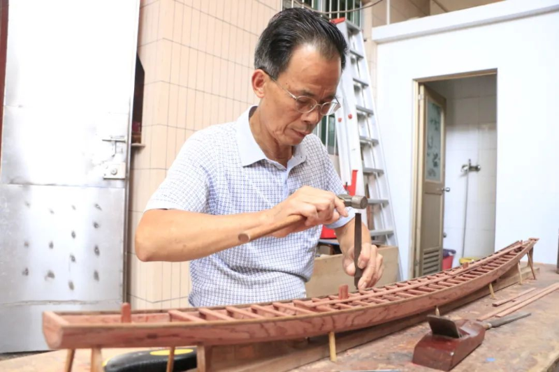 从选料、做底骨、钉蝴蝶底、反底起水、钉转水旁、做花旁、做大旁、安龙肠、上桐油灰到安龙头龙尾,冯沛朝独立执尺,掌握了100多道完整工序,贯穿其中的弹墨斗线更是其“绝活”,技术娴熟,力度得当,弹线匀速,笔直而准确,如今在中堂的龙舟制作中鲜少有人掌握。