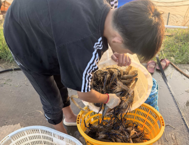 在养殖户张胜仔的水产养殖基地,岸边的箩筐整齐排列,刚从塘里捞起的南美白对虾、罗氏虾通体透亮,在筐里不停蹦跃,溅起的水珠沾在工人手上,却丝毫不影响大家的干劲——有人弯腰分拣大小虾,有人抬手将虾箱搬上货车,还有人笑着跟同伴算“今日收成账”。
