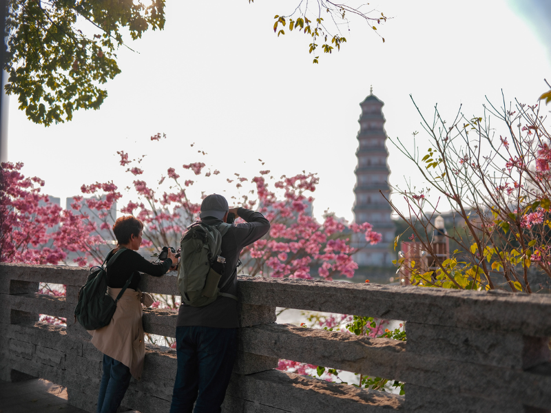 有老人在花树下打太极,动作舒缓如行云流水;有年轻的父母推着婴儿车慢慢走过,孩子仰着小脸,伸出胖乎乎的手去够那低垂的花枝;也有三两好友骑着共享单车沿江而行。隔江望去,金鳌洲塔的古朴轮廓在水天之间静静矗立,青灰色的塔身与满眼的粉紫花海形成了一种奇妙的对话——是古韵与春光的同框,是时间长河中一个恰到好处的定格。许多摄影爱好者专程赶来,架起长焦镜头,只为捕捉那花枝掩映中古塔若隐若现的一瞬。而即便是普通市民,随手举起手机,也能拍出一张颇具诗意的春日明信片。