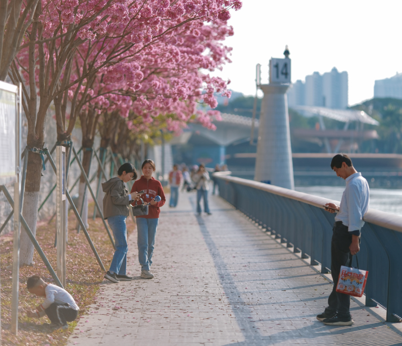 从莞城博厦的江南小公园沿江而行,紫花风铃木已在绿道旁悄然绽放,满树粉紫色的花团垂坠枝头,如云似霞,轻摇慢曳。风过处,花瓣微微颔首,将整条江岸染成了一幅流动的水彩画卷。