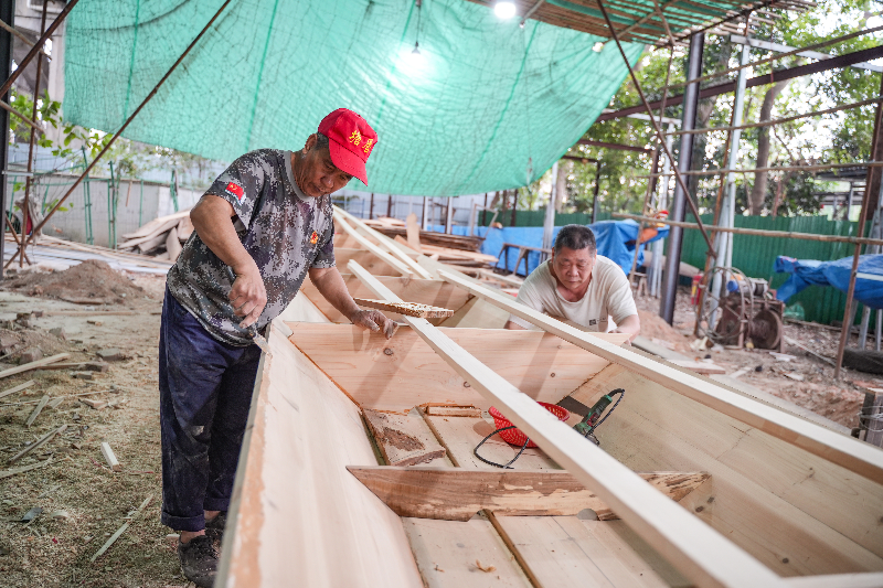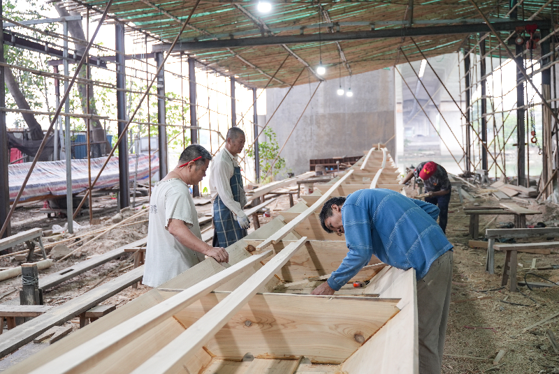 新式的比赛龙舟追求极致的速度,木板用料更薄,船身线条更直;而传统龙船则保留了更厚重的用料与形制。“一条传统龙的木料,差不多够做两条标准比赛船。”胡庆昌拍拍一条正在制作的新式龙船说道。