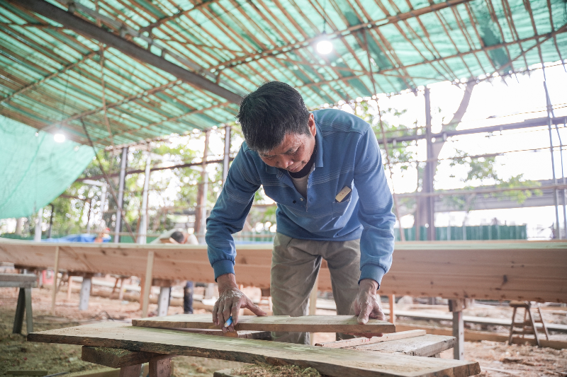 为了应对龙舟“大年”的压力,胡庆昌将师傅团队从平时的8人增加到了12人。这些老师傅大多师从东莞龙舟界的“老行尊”、中堂造船老师傅霍应驰,拥有数十年乃至更长时间的造船经验。其中一位指着远处河岸的方向说,那边某村一条已服役三十多年的老龙船,就出自他们几位老伙计之手。