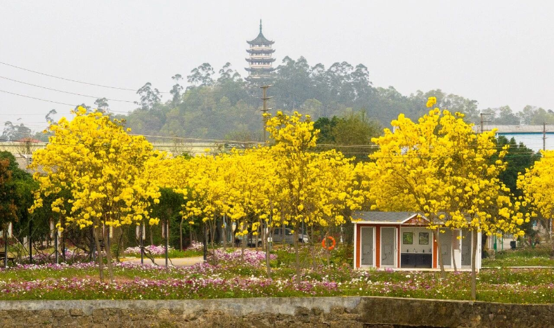 美翻了!黄花风铃木绽放,桥头上演春日视觉盛宴
