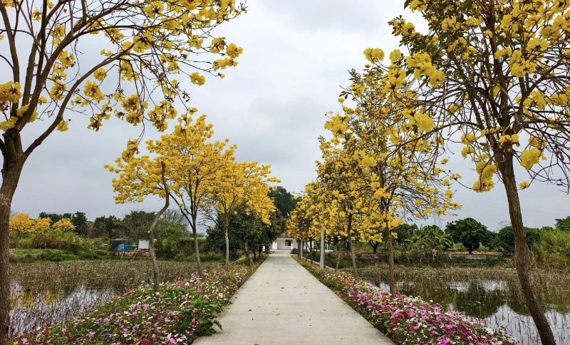 步入七彩花田,仿佛跌入了一个被打翻的调色盘。一株株黄花风铃木沿田埂错落排列,舒展的枝条如金伞般撑开。
