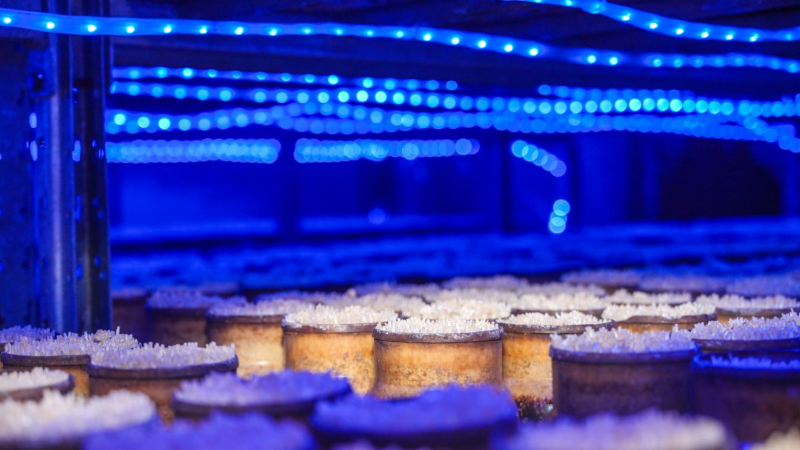 这一过程中,温度、湿度、光照、气体交换均由系统自动调控。例如蓝光照射可促进特定菌类的形态发育,恒温恒湿则保证其生长稳定性。整个生产链条中,菌菇几乎不与外界接触,仅在最后包装环节进行一次人工操作,从而最大程度降低污染风险。