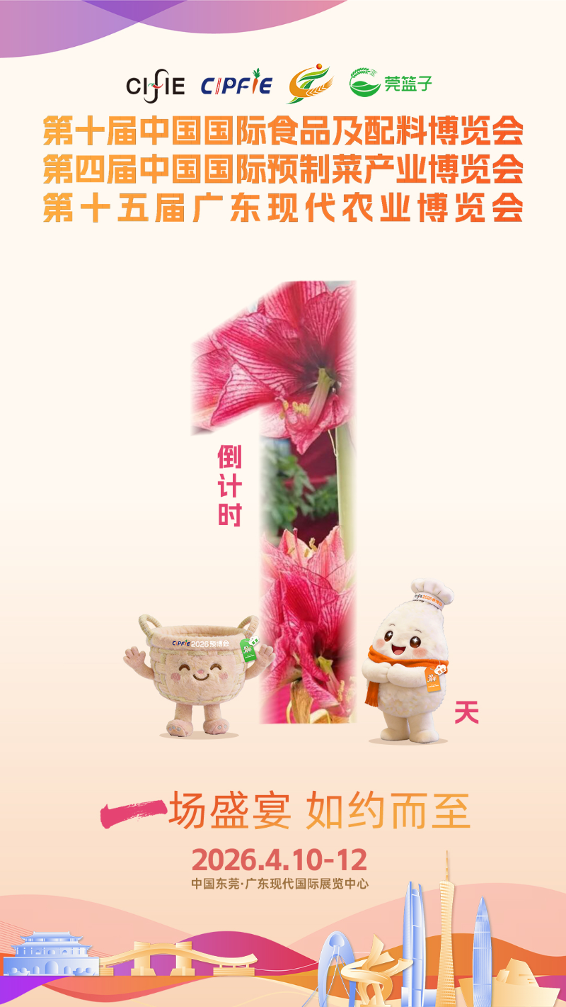 4月10日至12日,2026“食博会·预博会和农博会”将在广东东莞举行,开启农食行业新篇章。本届展会展览总面积超过5万平方米,预计吸引来自国内外的众多农食企业、采购商和行业机构参展参会。距离展会开幕还有1天,南方报业传媒集团东莞分社特推出倒计时海报,一场盛宴,如约而至,2026“食博会·预博会和农博会”期待您的到来。