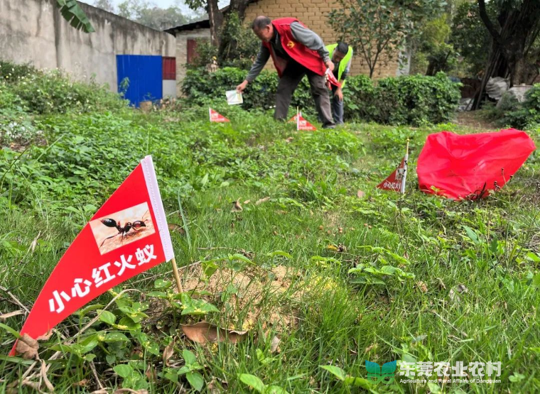 近日,天气温暖湿润,是红火蚁繁殖活动的高发期,也是红火蚁防控的关键时期。企石镇农技中心联合各村(社区)开展第二轮统一施药防控红火蚁行动。在南坑田园公园行动中,企石镇农技中心指导相关工作人员辨识红火蚁巢穴,确定后插上标记有“小心红火蚁”旗子,并指引其进行正确施药。
