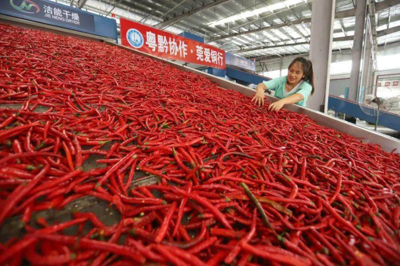 在贵州梵净红食品有限公司厂区内,鲜红的辣椒堆成小山,7条25吨级全自动烘干生产线正24小时不停运转,热浪裹挟椒香,一幅红火的丰收画卷正徐徐展开。