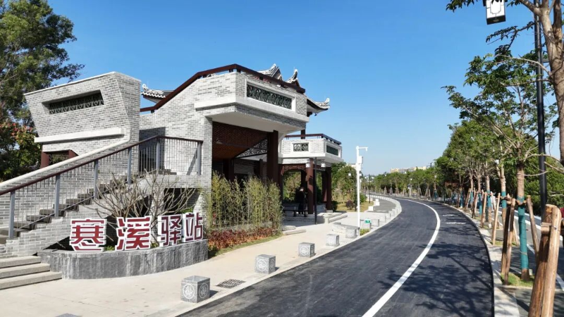 步入碧道,寒溪驿站、古码头复原景观、历史文化墙等文化节点错落分布,沥青步道、跑步道及车行道沿河岸延伸,路灯整齐排列、绿植花卉点缀其间,构成一幅“水岸相融、人景共生”的滨水生态画卷。