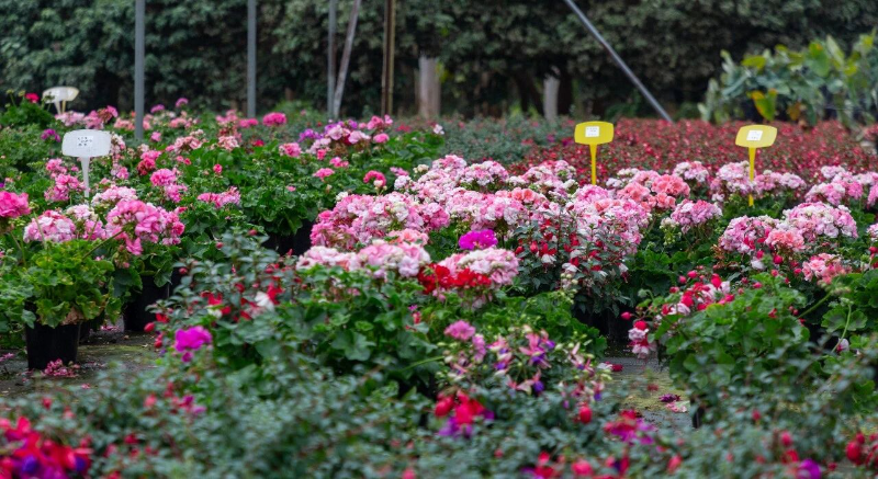 除“超级凤仙”外,基地还培育了天竺葵、龙面花、毛地黄、三角梅、一品红等近30个品种花卉,总量约50万盆,满足市民多样化需求。基地通过智能温室实现全年化生产,已形成集育苗、种植、销售于一体的产业链。
