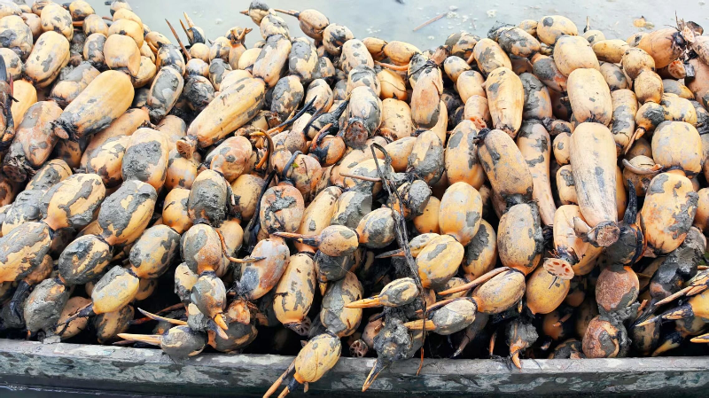 小船缓缓前行,新挖的莲藕堆成小山,沾着泥水,却掩不住玉色的肌肤。两小时,船舱已满。“我们在这里有百亩荷塘,亩产四千斤左右。”挖藕人介绍说。产量虽比往年略减,但每一寸藕节都是土地的馈赠。