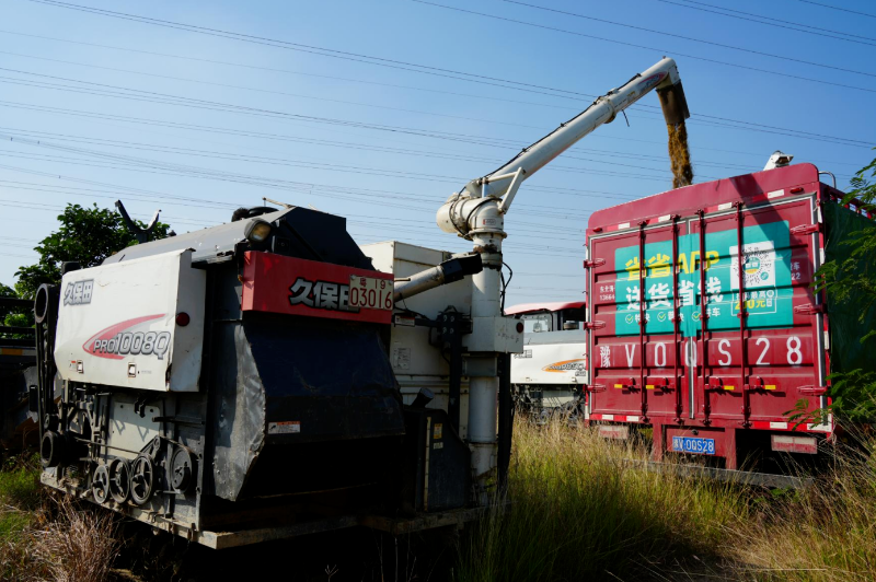 不远处,收割机轰鸣着驶入稻田,利刃挥过,稻秆倒伏、脱粒、秸秆粉碎一气呵成,饱满稻谷顺着管道倾泻入货车。