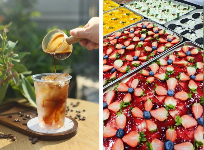 捧着邮政咖啡、现做茶饮,来一份大头虾饼蚝饼、弥敦道牛杂、固体杨枝甘露、潮汕油柑汁……配上“镀金”的背景,随便一拍都是朋友圈“C位”。