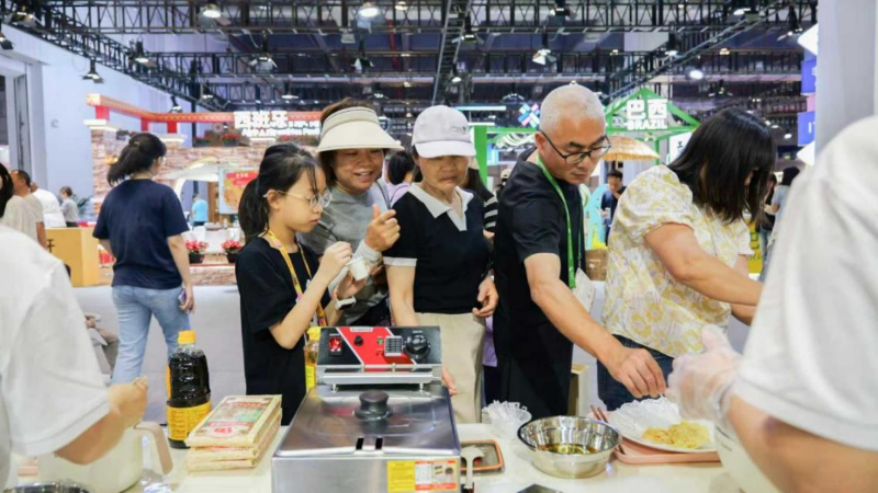 鲁花大油条、自然鲜腌黄瓜、高油酸烙鸡蛋饼、鲁花葱油面、五常大米……2026“食博会·预博会和农博会”鲁花馆前,一道道美食整齐陈列,现场食客端盘持杯、跃跃欲试,待美食出锅便争相品尝、大快朵颐,成为本届展会上一道风景线。