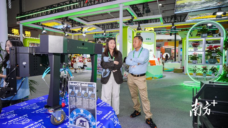 在第十五届广东现代农业博览会智慧农业展区,农业无人机、采摘机器人等智能农机装备揭开未来农业面纱,展现了广东加快培育农业新质生产力的最新成果。无人化、智能化也成为该展区今年的关键词。