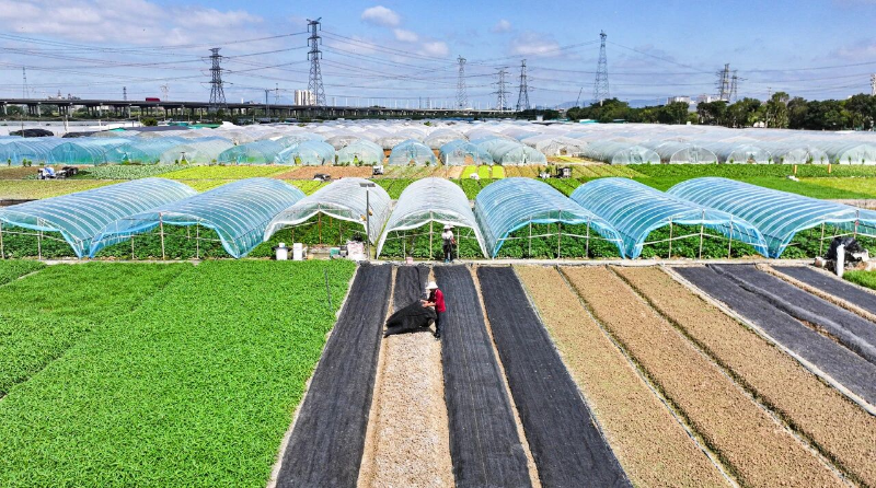 深秋时节,凉意渐浓,但位于谢岗镇赵林村的东莞市铭恩农业发展有限公司千亩蔬菜基地却是一派热火朝天的丰收景象。露天种植区,整齐划一的田垄上,各类应季蔬菜长势喜人;连片的温室大棚内,翠绿的反季节叶菜在适宜的环境中茁壮成长。地头上,农户们穿梭其间,熟练地进行采收、分拣、装筐等工作。收购点,一辆辆满载新鲜蔬菜的运输车整装待发,一幅以“丰收”为主题的动人画卷正在徐徐展开。