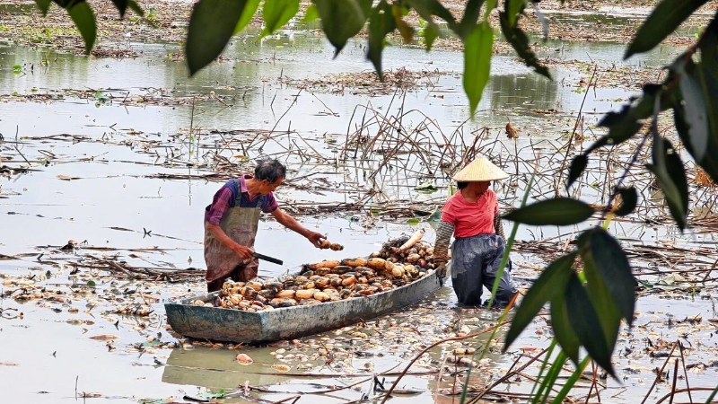 小船缓缓前行,新挖的莲藕堆成小山,沾着泥水,却掩不住玉色的肌肤。两小时,船舱已满。“我们在这里有百亩荷塘,亩产四千斤左右。”挖藕人介绍说。产量虽比往年略减,但每一寸藕节都是土地的馈赠。