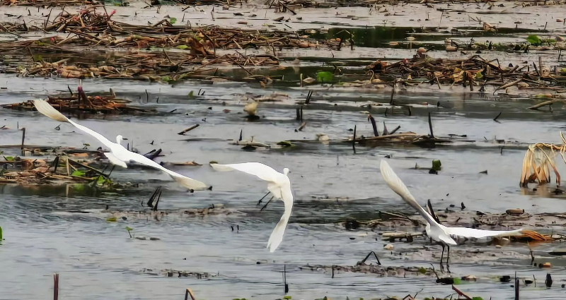 秋日,厚街镇溪头社区的大片荷塘里,残梗垂首,勾勒出秋的笔触。一大群白鹭聚集在这里,时而俯身啄食,惊起涟漪;时而掠过水面,点破天空的倒影。秋风裹着凉意,吹来了丰收的气息。