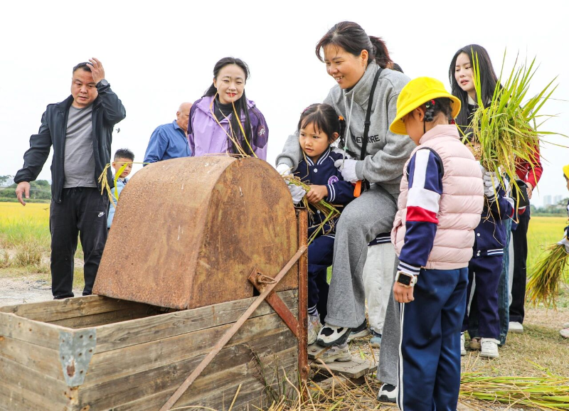“左手抓住稻秆下部、右手收割……”在农民伯伯的示范教学下,孩子与家长们掌握了动作要领,纷纷戴上手套、拿起小镰刀,开始亲身体验收割稻谷,并使用传统打谷机进行脱谷,成熟的稻粒如金色的雨点般滚滚而下,发出噼里啪啦的欢快声响。