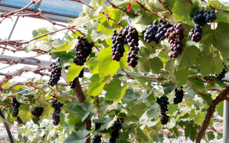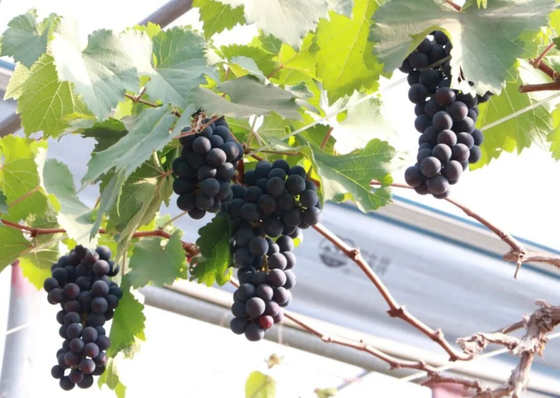 走进棚内,一串串紫黑发亮的葡萄挂在繁茂的藤蔓上,颗颗果实饱满圆润,表面还覆盖着薄薄的果粉,在阳光下泛着诱人的光泽。