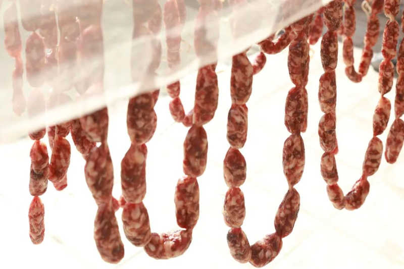 凑近细看,油光锃亮的肠衣裹着饱满的肉粒,玫瑰红的肉影在肠衣里若隐若现。在阳光下晒足三天,腊肠的颜色会变得深沉油润,用手轻捏,肉质紧实却带着弹性。