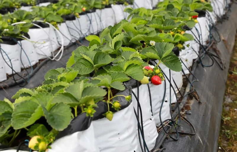 种植户潘满相介绍,园内的草莓采用高架无土栽培种植方式,使用基质固定草莓的根系并从中吸收营养和氧气;自动水肥一体化的滴灌设备,可以实现智能化的灌溉、施肥,让草莓及时获取水分和养分。