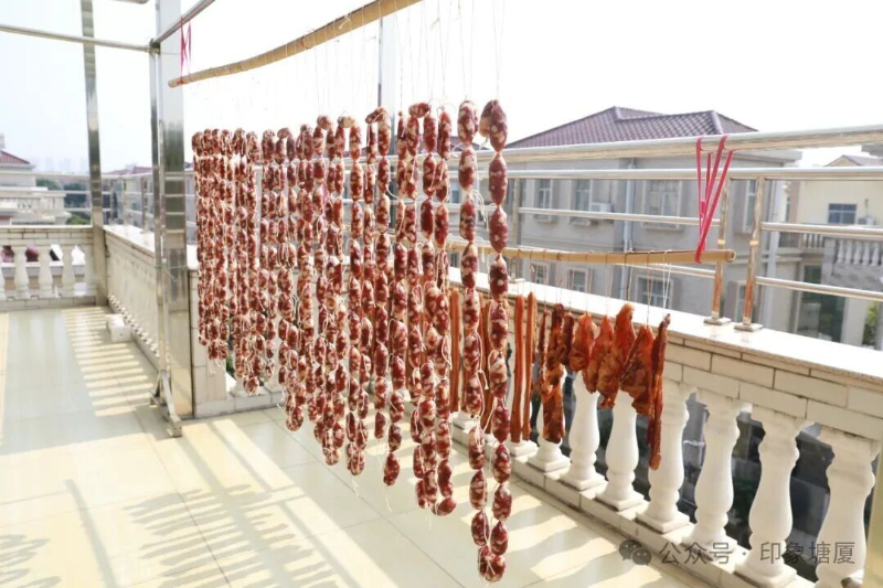 阳台上,肥瘦相间的腊肉油光锃亮,红白纹理清晰可辨;紧实的腊肠垂挂如帘,香料与猪肉的香气阵阵飘散。