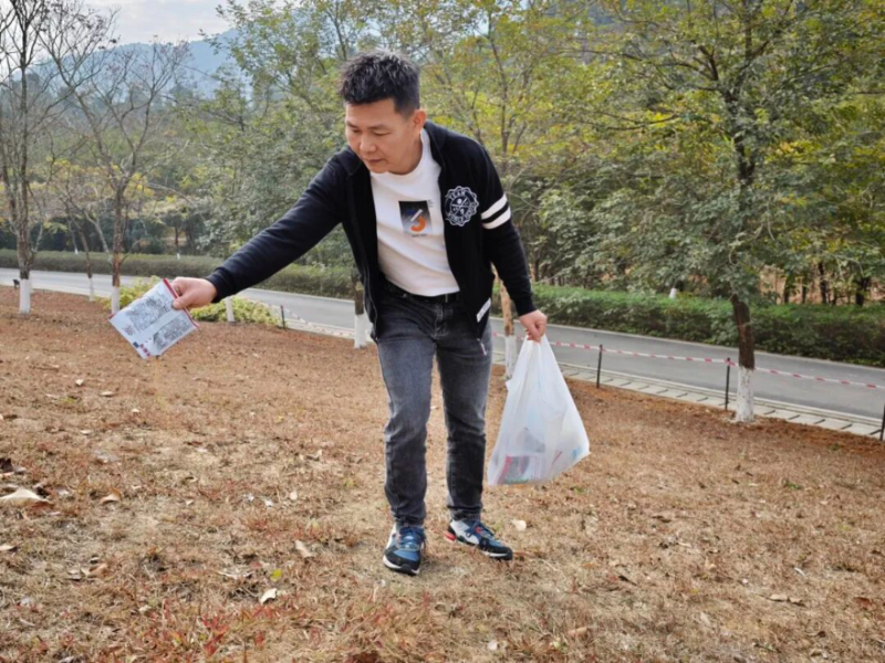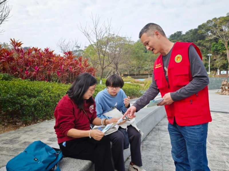 在九洞森林公园,不少市民正在散步游玩。樟木头农林水务局工作人员沿着草地、水边展开地毯式排查,发现蚁巢后,立刻撒施防治药剂,现场实施粉剂灭杀。同时,工作人员向市民派发科普手册,讲解红火蚁的危害以及如何避免叮咬、蜇后处理方法等知识。