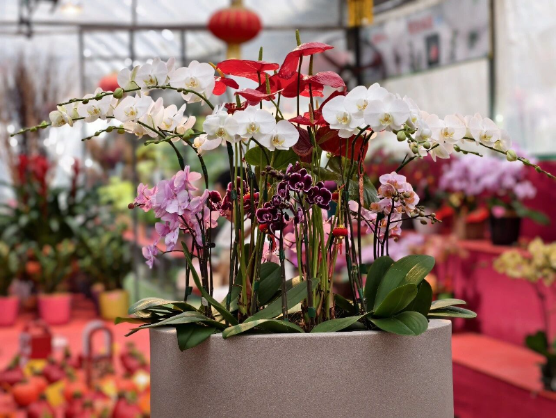 “鸿运当头”“步步高升”“金玉满堂”......各式年宵花搭配着喜庆的“花名”,满眼都是看得见的“年味”。寓意幸福美满的蝴蝶兰、金灿灿的年桔、大展宏图的红掌、健康长寿的万寿菊等各类年宵花长势良好,花农正忙着打理造型,迎接销售高峰。
