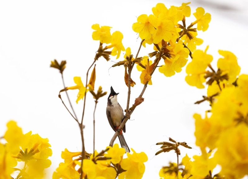 枝头之上,鹅黄色的花朵密密匝匝簇拥成团,远望如金色云霞倾泻人间,近看似万千风铃在枝头摇曳。