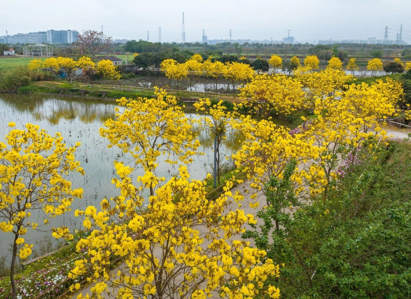 美翻了!黄花风铃木绽放,桥头上演春日视觉盛宴