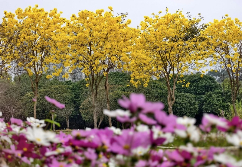 步入七彩花田,仿佛跌入了一个被打翻的调色盘。一株株黄花风铃木沿田埂错落排列,舒展的枝条如金伞般撑开。