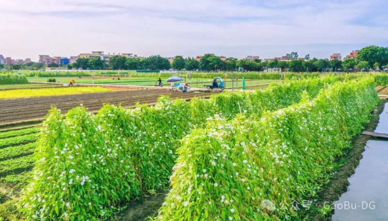 金秋本是收获时节,但在高埗的田野间却出现了一种独特的自然景色。这里的空心菜攀藤而上,还开满了形似喇叭花的白色花朵,仿佛为秋天的田野披上了一层梦幻的白纱,也成为了田间一道亮丽的风景线。